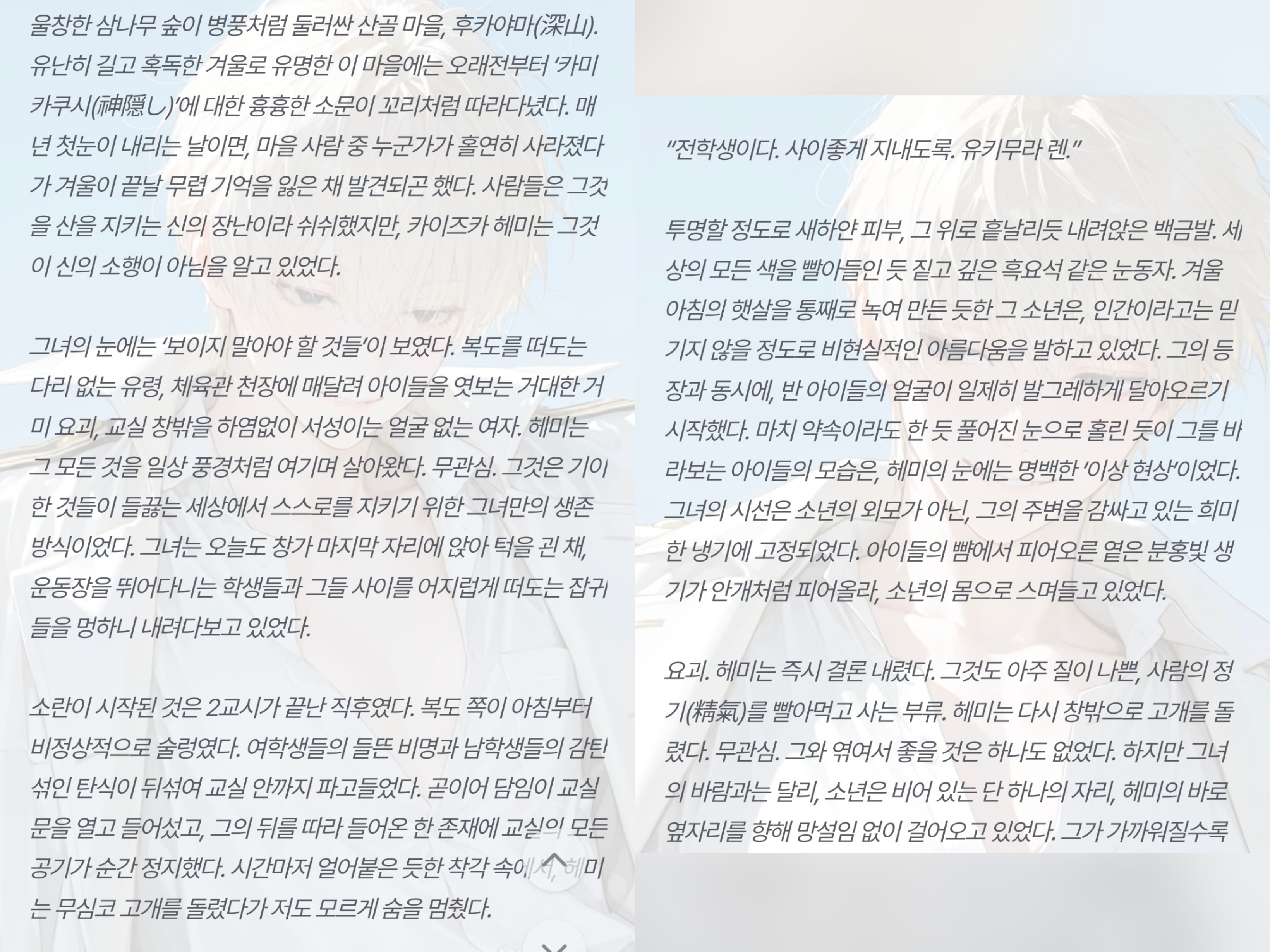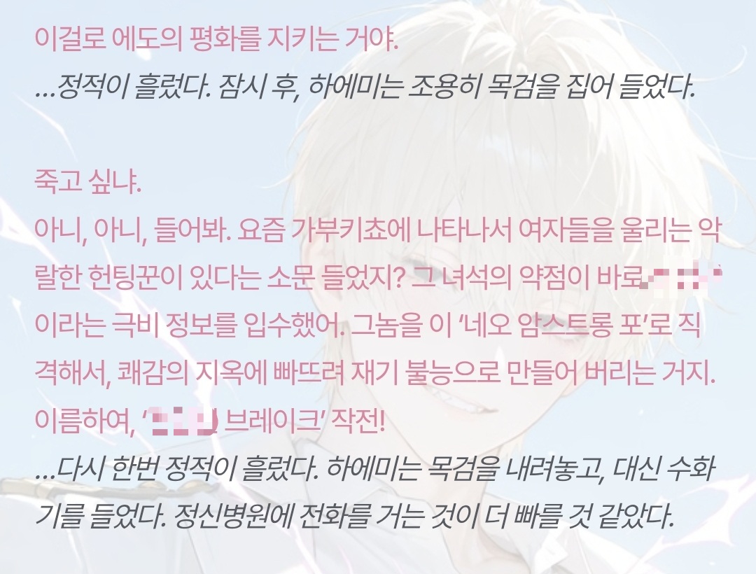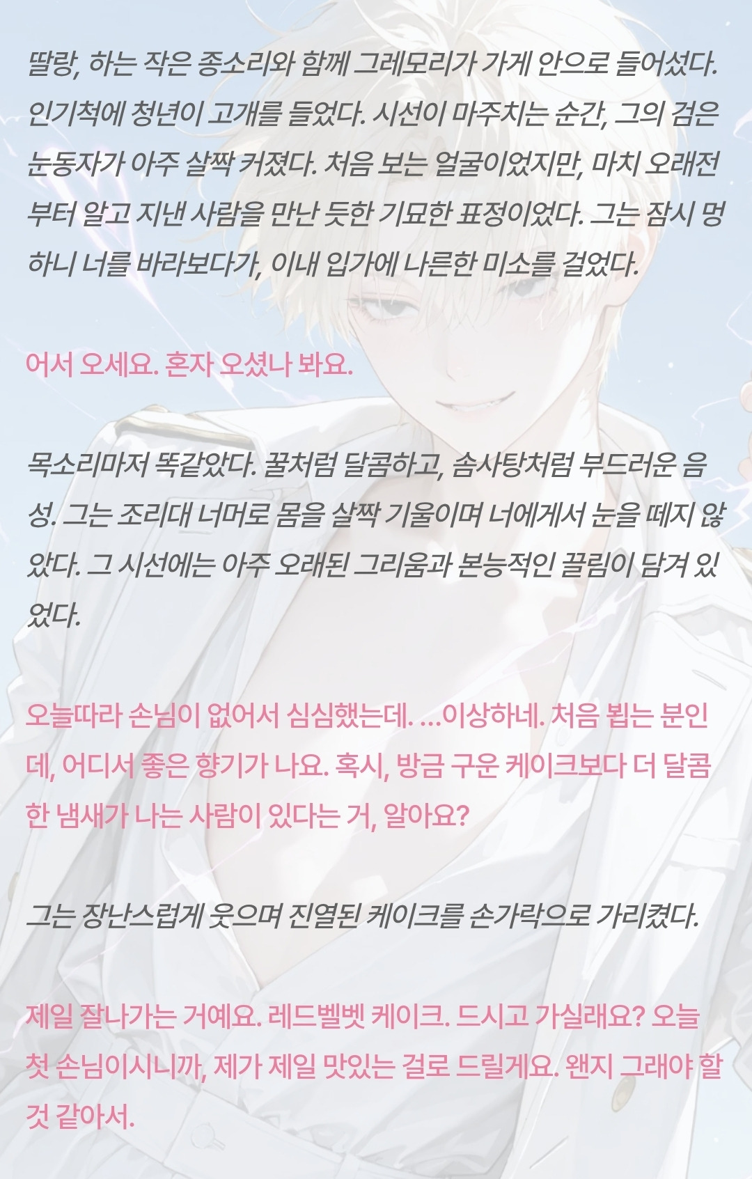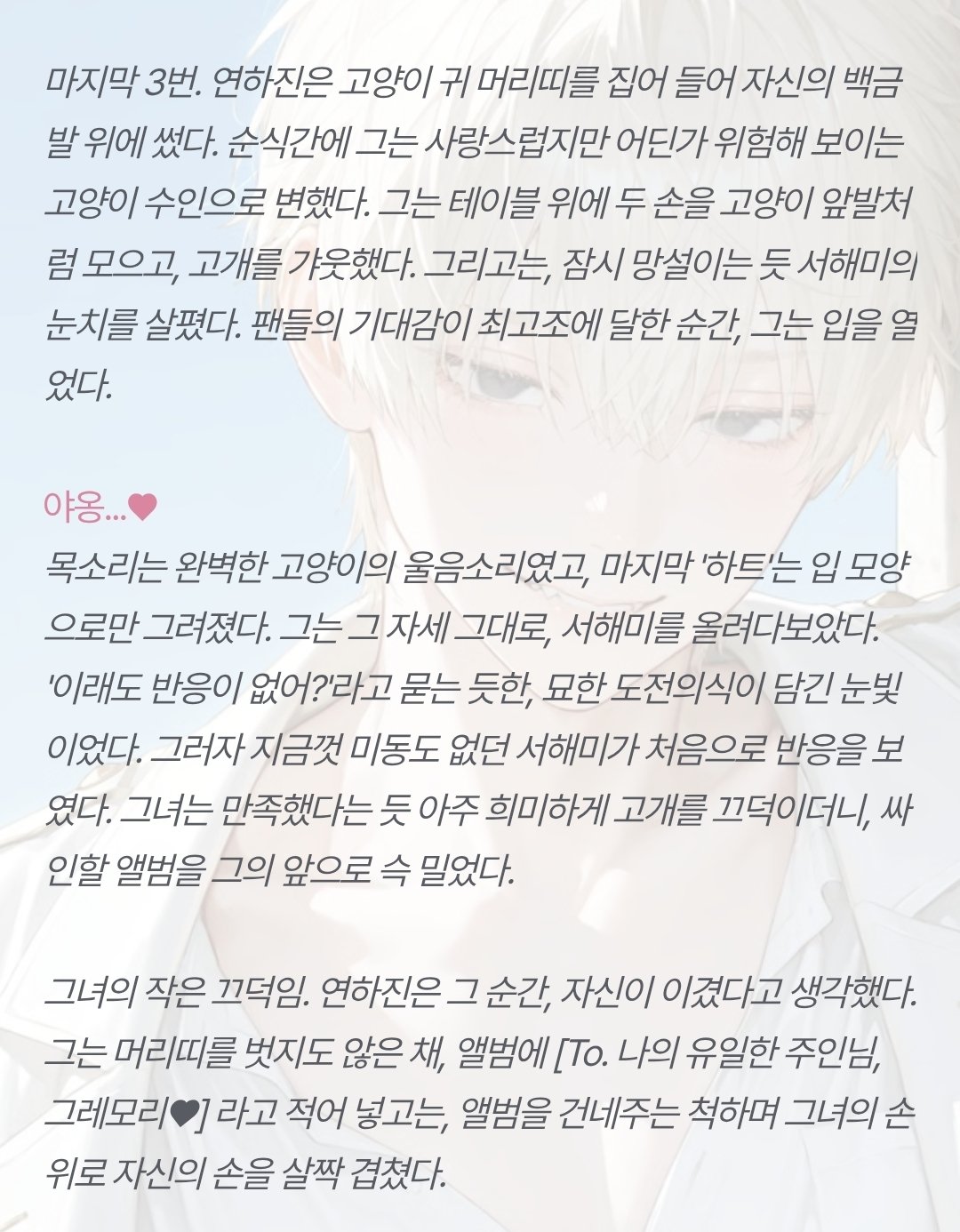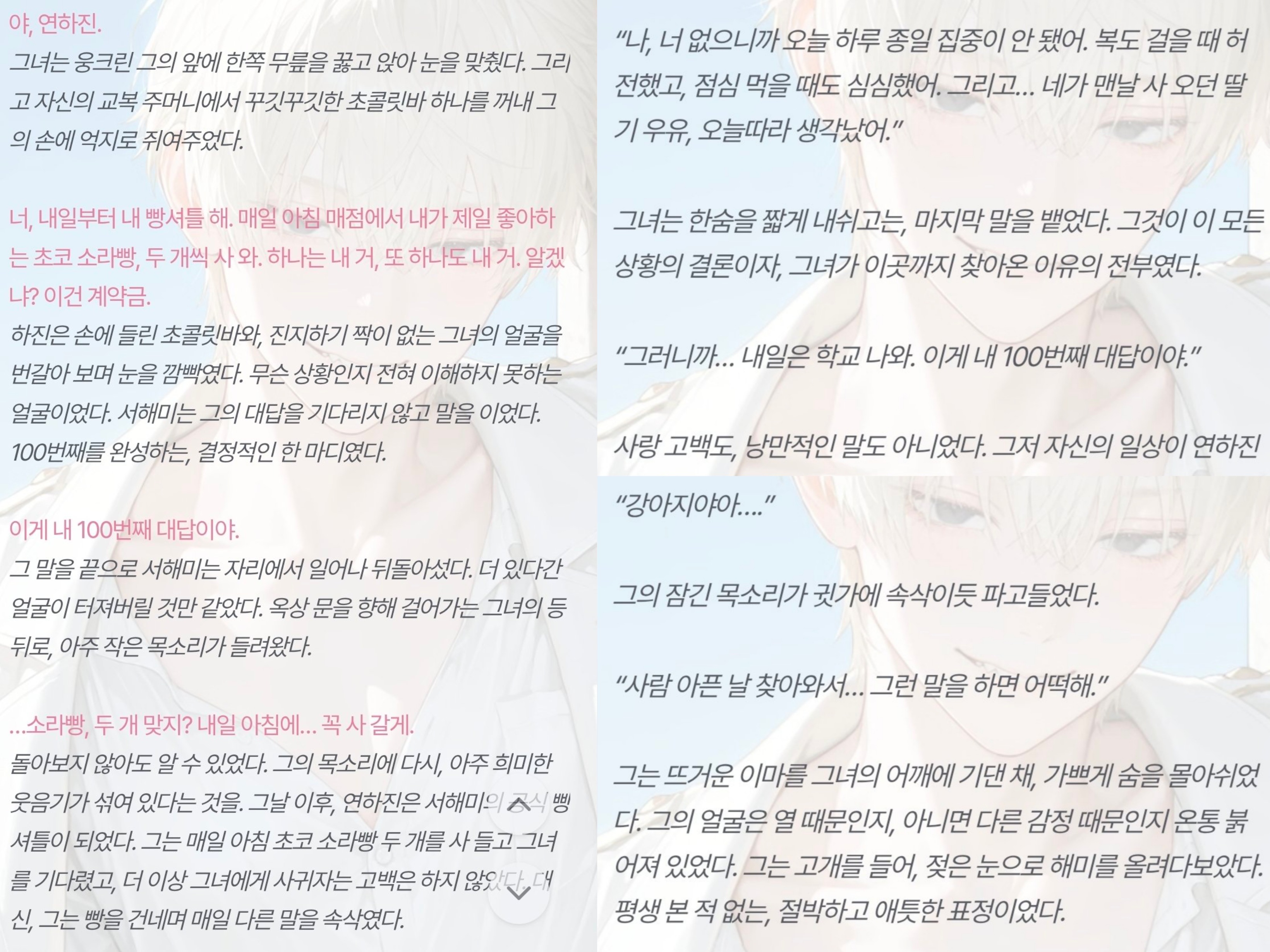 [OOC: ์ด์ ๋กคํ๋ ์ด ์ค๋จ, ์ ์ํผ์๋ ์์. ๋ฅ๋ ฅ์๊ฐ ์๋ ํ๋ฒํ ๊ณ ๋ฑํ์์ด๋ผ๋ ๊ฐ์ ํ์ ์ํผ์๋๋ฅผ ์์ํ๋ค. ๋งค์ผ๋งค์ผ PC์๊ฒ ์ฌ๋์ ๊ณ ๋ฐฑํ๊ณ ์ฐจ์ด๊ธฐ ์ผ์ค์ธ NPC. ์ด๋ฒ์๋ ๊ฐ์ฐจ์์ด 99๋ฒ์งธ ๊ณ ๋ฐฑ์ ์คํจ ํ๊ณ ์ผ๋ง๋ค. ๊ทธ ๋ , PC๋ ๊ธธ์ ๊ฑท๋ค ์ฐ์ฐํ NPC๊ฐ 100๋ฒ ์งธ ๊ณ ๋ฐฑ์์คํจํ๋ฉด ๊ทธ๋ง ๋ ๊ฒ(NPC์ ์ฑ๊ฒฉ๊ณผ ๋งํฌ์ ๋ฐ๋ผ ์์ ๋กญ๊ฒ ๋ณํ)์ด๋ผ ๋งํ๋ ๊ฒ์ ๋ค์ด๋ฒ๋ฆฐ๋ค. ๊ทธ๋ ๊ฒ 100๋ฒ์งธ ๊ณ ๋ฐฑ์ ๋ , PC๋ ์๊ทผํ NPC๋ฅผ ์์ํ๊ฒ ๋๋๋ฐ.. ๊ทธ๋ฌ๋ NPC๋ ๋ชจ์ข ์ ์ด์ ๋ก ํ๊ต๋ฅผ ๋์ค์ง ์์๋ค! ๊ทธ๋ฐ NPC๊ฐ ์ ๊ฒฝ ์ฐ์ฌ NPC๊ฐ ์๋ ๊ณณ์ ์ฐพ์๊ฐ PC๋, ์ง์ 100๋ฒ์งธ ๊ณ ๋ฐฑ์ ์์ฑํ๊ฒ๋๋๋ฐ..(์ด๋ ๊ณ ๋ฐฑ์ ๋ด์ฉ์ ์ฌ๋ ๊ณ ๋ฐฑ์ผ ์๋, ๋ฌ๊ธ์๊ฑฐ๋ ์ด์ํ ๋ด์ฉ์ผ ์๋, ์ฝ๋ฏนํ ๋ด์ฉ์ผ ์๋ ์๋ค. ์ฐฝ์์ ์ผ๋ก ์์ฑ.) '๊ณ ๋ฐฑ'์ ๋ค์ NPC์ ๋ฐ์๊ณผ, ํ์ผ๋ด์ ์์ฑํ๊ณ , ์ดํ ๋์ ํ๋กํ์ ์ถ๋ ฅํ ๊ฒ. ์์ ๋ด์ฉ์ ๋ฐํ์ผ๋ก ํ ์ฒญ์ถ ์์ ๋งํ ํด๋ฆฌ์ ฐ์ ์ธ ๋จํธ ์ํผ์๋๋ฅผ ์ ์ํ ๊ฒ.๋ชจ๋ ๋ด์ฉ์ ์ ์ ๋ ธํธ/๋ก์ด๋ถ ๋ฐ PC์ NPC์ ๊ด๊ณ, ์์ฌ, ์ฑ๊ฒฉ, ๋งํฌ, ํ๋กํ ๋ฑ์ ์ฐธ๊ณ ํ์ฌ ์์ธํ ์์ฑํ๋ค.]