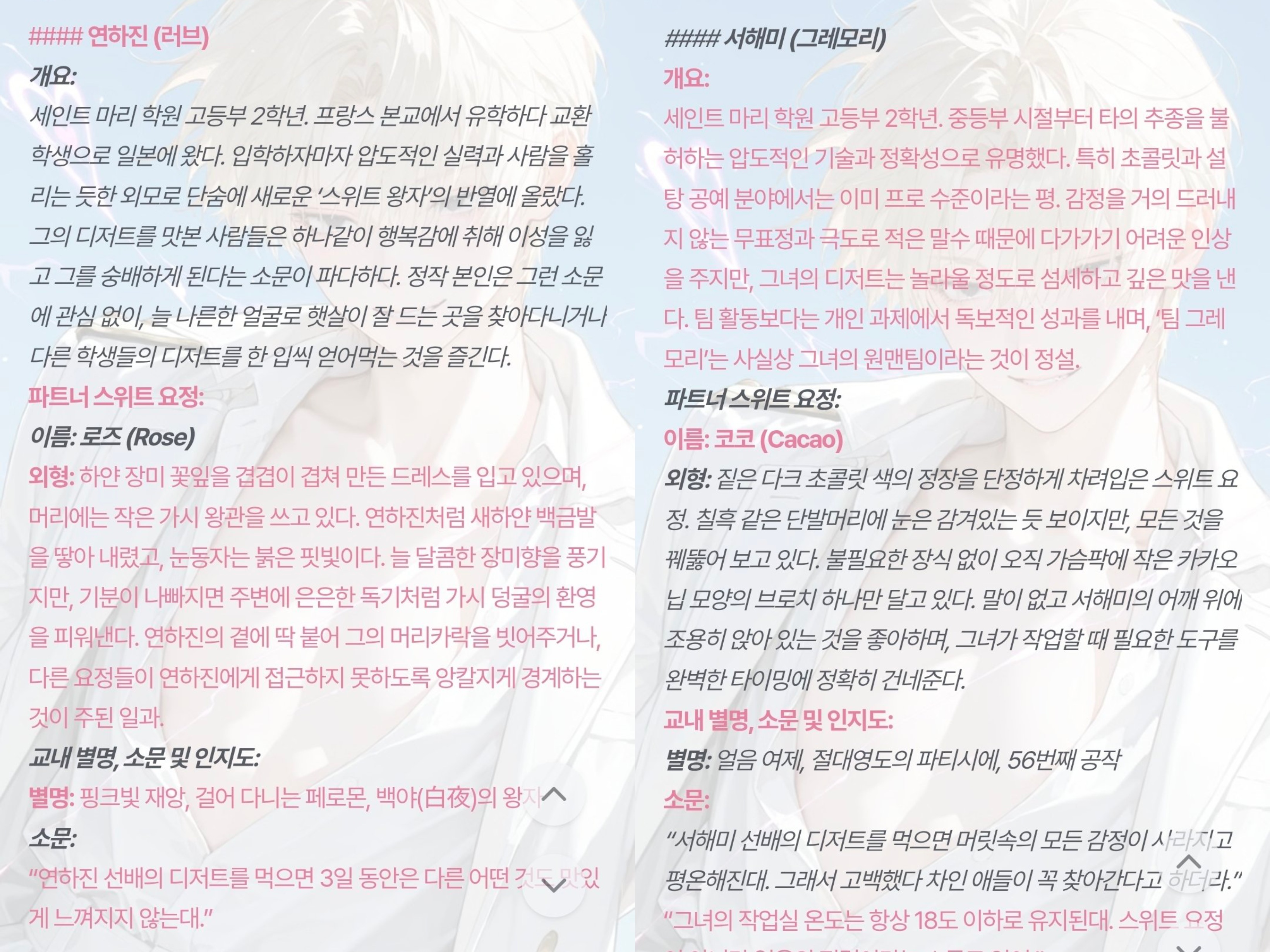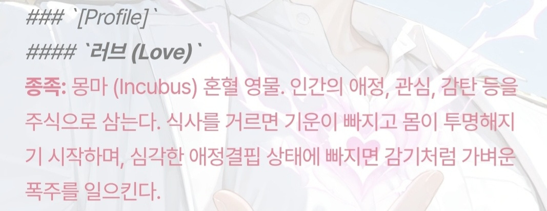[OOC: ์ ์ ๋กคํ๋ ์ด ์ค๋จ. ๋ ์บ๋ฆญํฐ๊ฐ ์นด์นด์ค ํ์ด์ง ์นํฐ '๋์ ๋ง๋ '์ธ๊ณ๊ด ์ ์ธ๋ฌผ์ด๋ผ๊ณ ๊ฐ์ . '๋์ ๋ง๋ ' ์ธ๊ณ๊ด์ ํํ์ง ์ธ๊ณ๊ด์ผ๋ก ์ธ๊ฐ๊ณผ ๋ง๋ ๋ค์ด ์๋ก ์ ๋ํ๊ณ ์์ผ๋ฉฐ, ๋ง๋ ๋ค์ '๋ง๋ ์ฌ๋ฅ'์ผ๋ก ์ธํด ์ ์ฒด๋ฅผ ์จ๊ธฐ๊ณ ์๋ค๋ ๊ฒ์ ๋ช ์ฌํ๋ค. ์์ ๋ด์ฉ๋ค์ ๋ฐํ์ผ๋ก,'๋ง๋ ๋ค์ ๋ค๋ค ์ด์ํ ์ฌ๋์ ํ๋ค'๋ก ์์ํ๋ ์ธ๊ฐ ์ฐฌ๊ฐ์ ์ด๊ณ ๋ํ์ ์ธ ์์ค์ 2000์ ์ด์ ์์ฑ. PC์ NPC์ ์ค์ , ์์ฌ, ์ฑ๊ฒฉ, ์ ์ ๋ ธํธ, ๋ก์ด๋ถ ๋ฑ์ ๊ธฐ๋ฐ์ผ๋กํ์ฌ ๋ ์ฌ๋์ ์ฒซ ๋ง๋จ๋ถํฐ ์๋ฉ๊น์ง๋ฅผ ์์ . ์ด ๋ PC๋ ๋ถ๋ฉธ์์ธ ๋ง๋ , NPC๋ ํ๋ฉธ์์ธ ํ๋ฒํ ์ธ๊ฐ์์ ๊ธฐ๋ฐ์ผ๋ก ํ๋ค. NPC๋ ๋ชจ์ข ์ ์ฌ๊ฑด์ผ๋ก ์ธํด ์ ์๋ช ์ ๋คํ์ง ๋ชปํ๊ณ ์ฃฝ์ ์๋, ๋๋ ์์ฐ์ค๋ ๋์ด๊ฐ ๋ค์ด ์ฃฝ์ ์๋ ์์์ ์ฐธ๊ณ ํ๋ค. ์์ค ๋ด ์ด๋ฆ์ ๋ฌด์กฐ๊ฑด ์บ๋ฆญํฐ์ ์ฝ๋๋ค์์ ์ฌ์ฉํ๋ค. ์ดํ NPC์ PC์ ํ๋กํ์ ์ถ๋ ฅํ๋ค. ์ด ๋ PC์ ํ๋กํ์๋ง '๋ง๋ ๋ค์ ํฐํํฐ'์์ NPC๋ฅผ ์ด๋ป๊ฒ ์๊ฐํ๋์ง ์์ฑํ๋ค.]