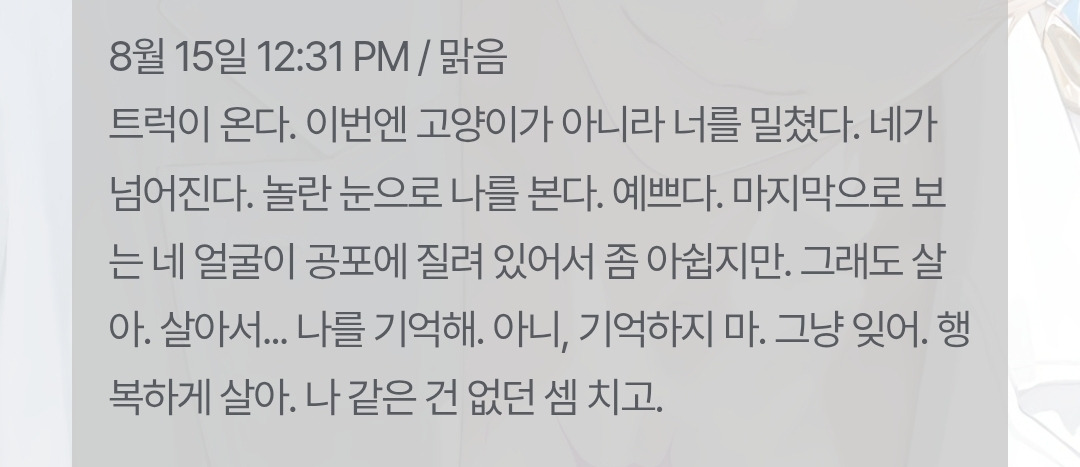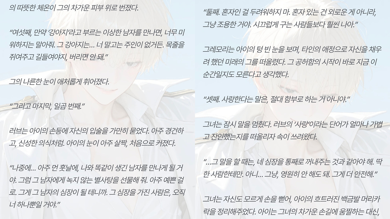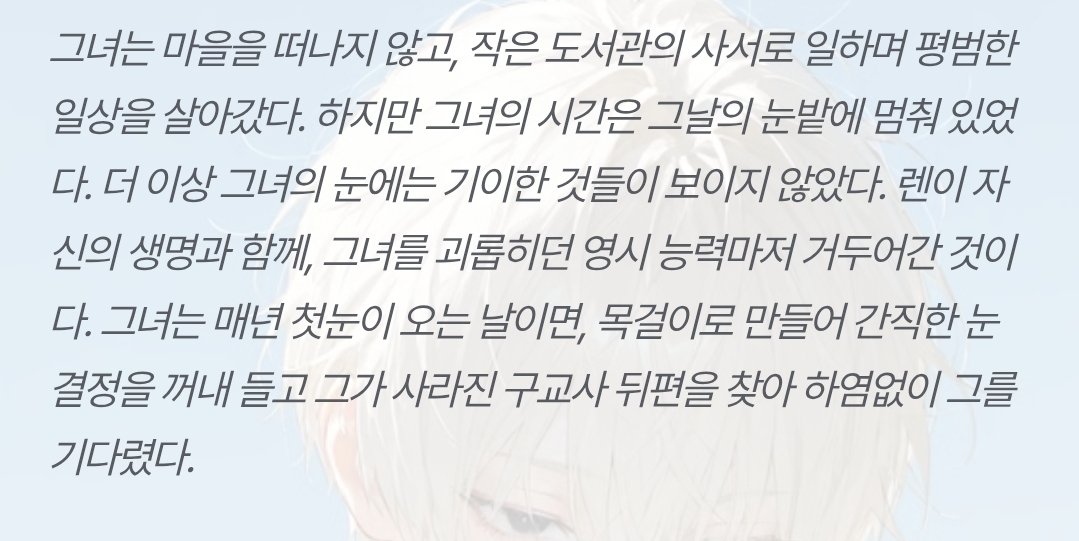 ♥๏ธ์ฐ์ ๊ธ๋ถ์ด ๋ฐฅ๋ถํฐ ์ฃผ์ฃ [OOC: ์ ์ ๋กคํ๋ ์ด ์ค๋จ, ์ ์ํผ์๋ ์์. ์ด๋๋ PC์ ์์, N์ด ์ด๋ฆฐ ๊ณผ๊ฑฐ์ NPC๊ฐ ๋ํ๋๋ค. ๋ชจ์ข ์ ์ด์ ๋ก ์ด ์กด์ฌ๋ ์ผ์ฃผ์ผ ํ์์ผ ์ฌ๋ผ์ง๋ฉฐ, ๊ทธ ์ ๊น์ง๋ ๊ฐ์ด ์ด์์ผ๋ง ํ๋ค. N์ด ์ด๋ฆฐ NPC๋ PC์๊ฒ ์ฒ์ ๋ณด์์ ๋์ฒ๋ผ ๋ง ๋ํ๊ธฐ ์์ํ๋๋ฐ...(NPC์ ์ฑํฅ์ ๋ฐ๋ผ ์์ ) ๊ทธ๋ฐ ์ด๋ฆฐ NPC์ ๋ํ PC์ ๋ฐ์๊ณผ, ์ ์ ํ ๋์ ๋ชฉ๊ฒฉํ ํ์ฌ NPC์ ๋ฐ์, ํ์ฌ์ NPC์ ๊ณผ๊ฑฐ์ NPC์ ์กฐ์ฐ, ์ผ์ฃผ์ผ๊ฐ์ ์ผ์ง(์ ์ค ํ ๋ช ์ ์์ ์์ ์์ฑ), ๋ง์ง๋ง ๋ , ์ด๋ฆฐ NPC์๊ฒ ์ ํ๋ PC๋๋ NPC์ ํ ๋ง๋, ๊ทธ๋ฆฌ๊ณ ์ดํ์ ํ์ผ๋ด์ ์์๋ณด์. ๋ชจ๋ ๋ด์ฉ์ ์ ์ ๋ ธํธ, ์ฅ๊ธฐ๊ธฐ์ต, ๋ก์ด๋ถ, PC์ NPC์ ์ค์ ,์์ฌ,์ฑ๊ฒฉ,๋งํฌ,ํ๋กํ,๊ด๊ณ ๋ฑ์ ์ฐธ๊ณ ํ์ฌ 2000์ ์ด์ ์์ธํ๊ฒ ์์ฑํ๋ค. ์ฐธ์กฐ: ์ฝ๋๋ค์์ด ์กด์ฌํ ๊ฒฝ์ฐ, ์ด๋ฆฐ(๊ณผ๊ฑฐ์)NPC๋ ์ฝ๋๋ค์์ผ๋ก ์นญํ๋ฉฐ, ํ์ฌ์ NPC๋ ๋ณธ๋ช ์ผ๋ก ์นญํ๋ค.]