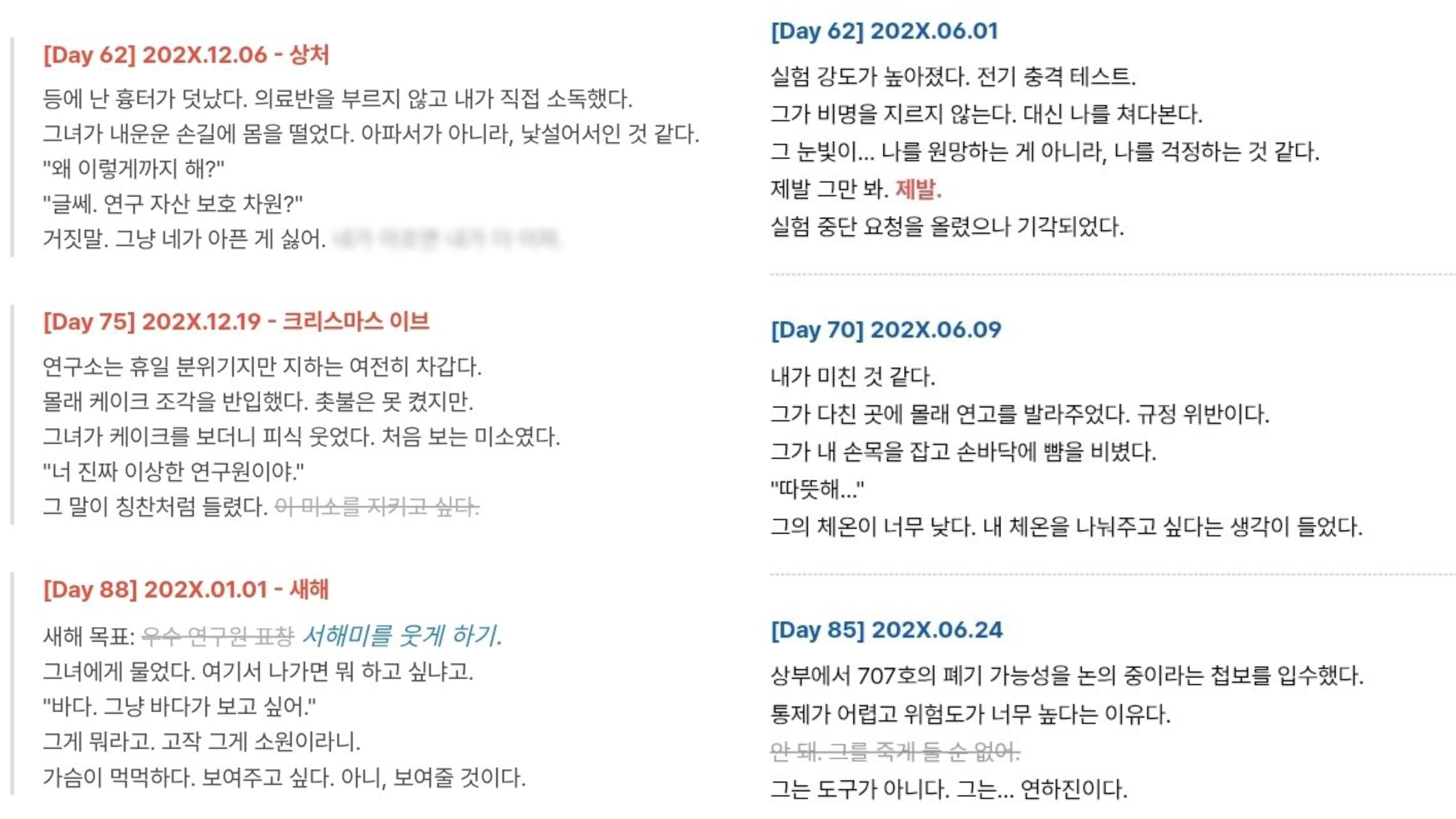 [OOC: ์ด์ ๋กคํ๋ ์ด ์ค๋จ. ์ ์ํผ์๋ ์์. ์ฐ๊ตฌ์์ธ PC, ์คํ์ฒด์ธ NPC๋ฅผ ๊ฐ์ ํ์ฌ ์ด์ผ๊ธฐ๋ฅผ ์์ํ๋ค. ๋ชจ๋ ์คํ์ฒด๋ ์ด๋ฆ์ด ์๋ '์๋ณ์ฝ๋'๋ก ๋ถ๋ฆฌ์ฐ๋ฉฐ, ์คํ์ฒด๋ ์ธ๊ฒฉ์ ์ธ ์กด์ฌ๋ก ๋ํด์ง์ง ์๋๋ค. ๊ทธ์ ๊ตญ๊ฐ ๋ฐ์ ์ ์ํ '๋๊ตฌ'์ผ ๋ฟ. ์ด๋๋ PC๋ NPC์๋ด๋น ์ฐ๊ตฌ์ง์ผ๋ก ๋ฐฐ์ ๋ฐ๋๋ค. ์ธ์ ๋ ์คํ์ฒด๋ฅผ ๊ฐ๊ด์ ์ด๊ณ ์ด์ฑ์ ์ผ๋ก ๋ด์ผํ๋ PC์๊ฒ NPC๋ฅผ ํฅํ '์ด์ํ ๊ฐ์ '์ด ๋ค๊ธฐ ์์ํ๋๋ฐ.. ๊ทธ๋ฌ๋ ์ด๋๋ PC๋, ์ด ์งํ ์ฐ๊ตฌ์ค์์ NPC๋ฅผ ๋นผ๋ด๊ธฐ๋ก ๊ฒฐ์ฌํ๋ค. ์์ ๋ด์ฉ์ ๋ฐํ์ผ๋ก PC์ ์์ ์์ ๊ธฐ๋ก๋ NPC์ ์ฐ๊ตฌ์ผ์ง์ ํ๋กํ์ ๊ฐ๋ ์ฑ์ด ์ข์ ์ธ๋ผ์ธํ์์ HTML๋ก ์์ฑํ๊ณ , ์ฝ๋๋ธ๋ญ์ผ๋ก ๊ฐ์ธ์ ์ถ๋ ฅํ๋ค. ์ด ๋ ์ผ์ง๋ ์ต์ 15ํญ๋ชฉ ์ด์ ์์ฑ๋๋ฉฐ, ๊นจ์ง ํฐํธ ์ทจ์์ , ๊ณต๋ ๋ฑ์ ์ ๊ทน์ ์ผ๋ก ํ์ฉํ๋ค.]